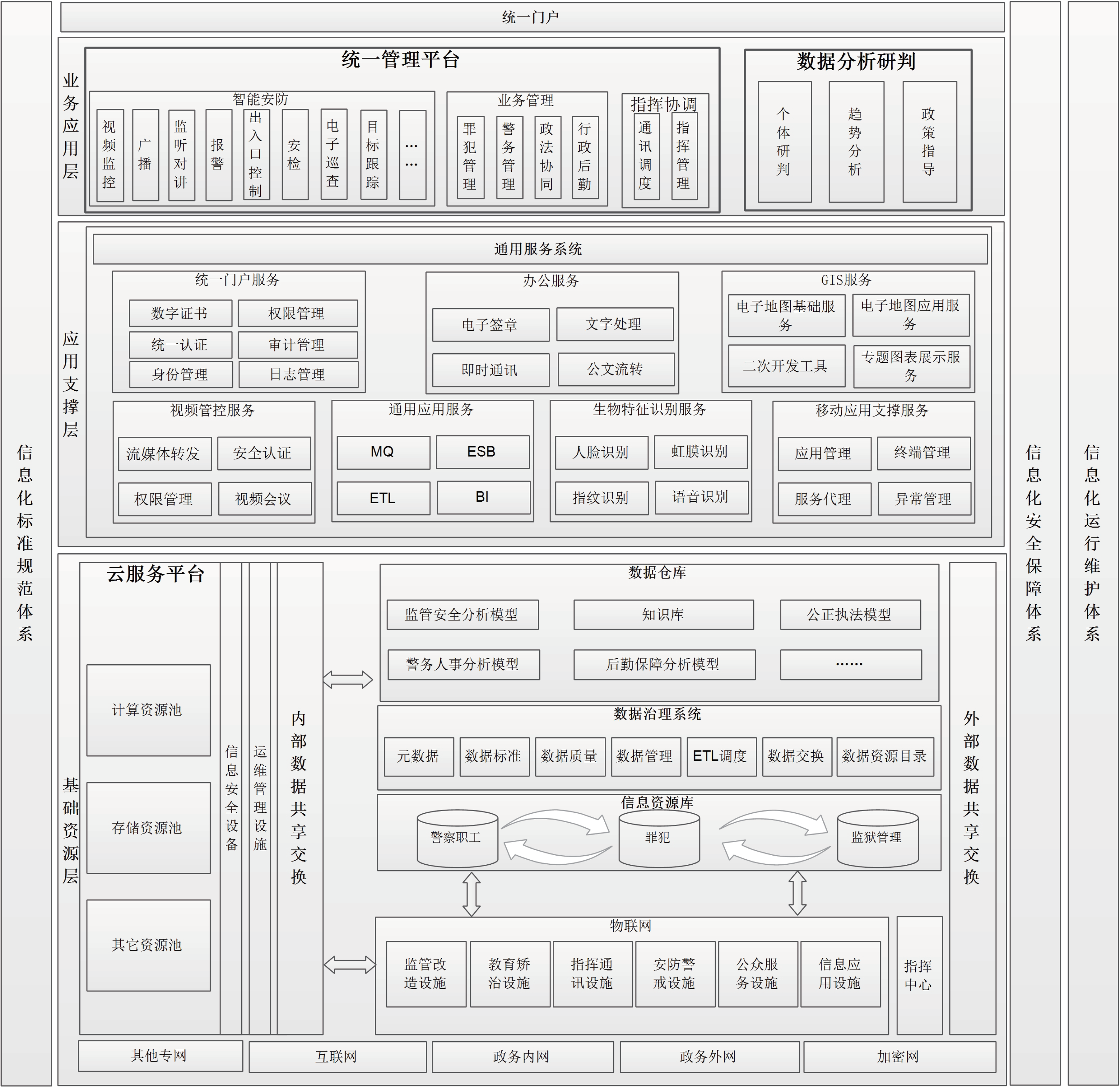 智慧监狱应符合国家和司法部信息化标准规范体系,具有信息化安全保障体系和信息化运行维护体系,拥有完整的安防、业务、指挥和数据分析研判功能。